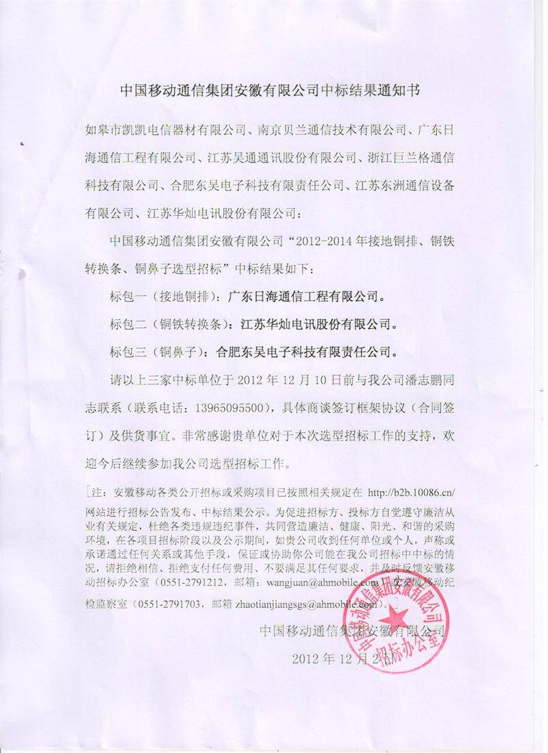 2012年安徽移动铜鼻子中标通知书